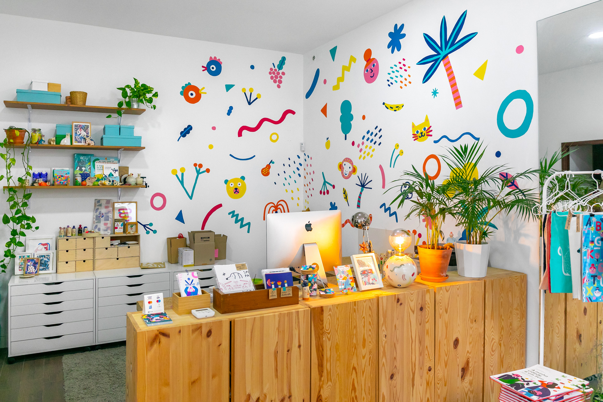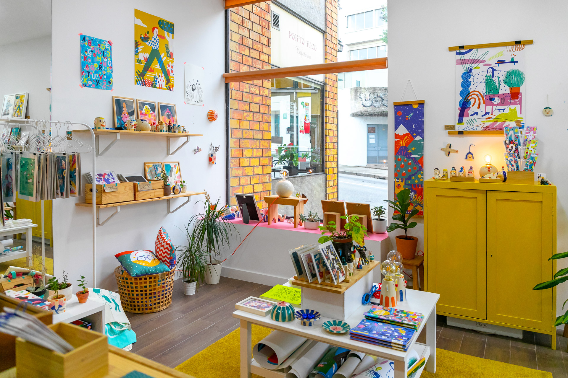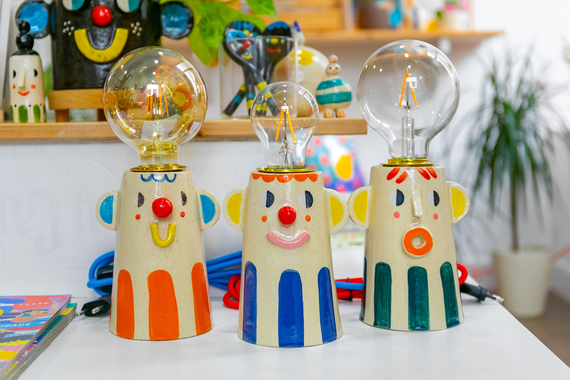 Peças de cerâmica de autor, ilustrações, posters, candeeiros, livros.