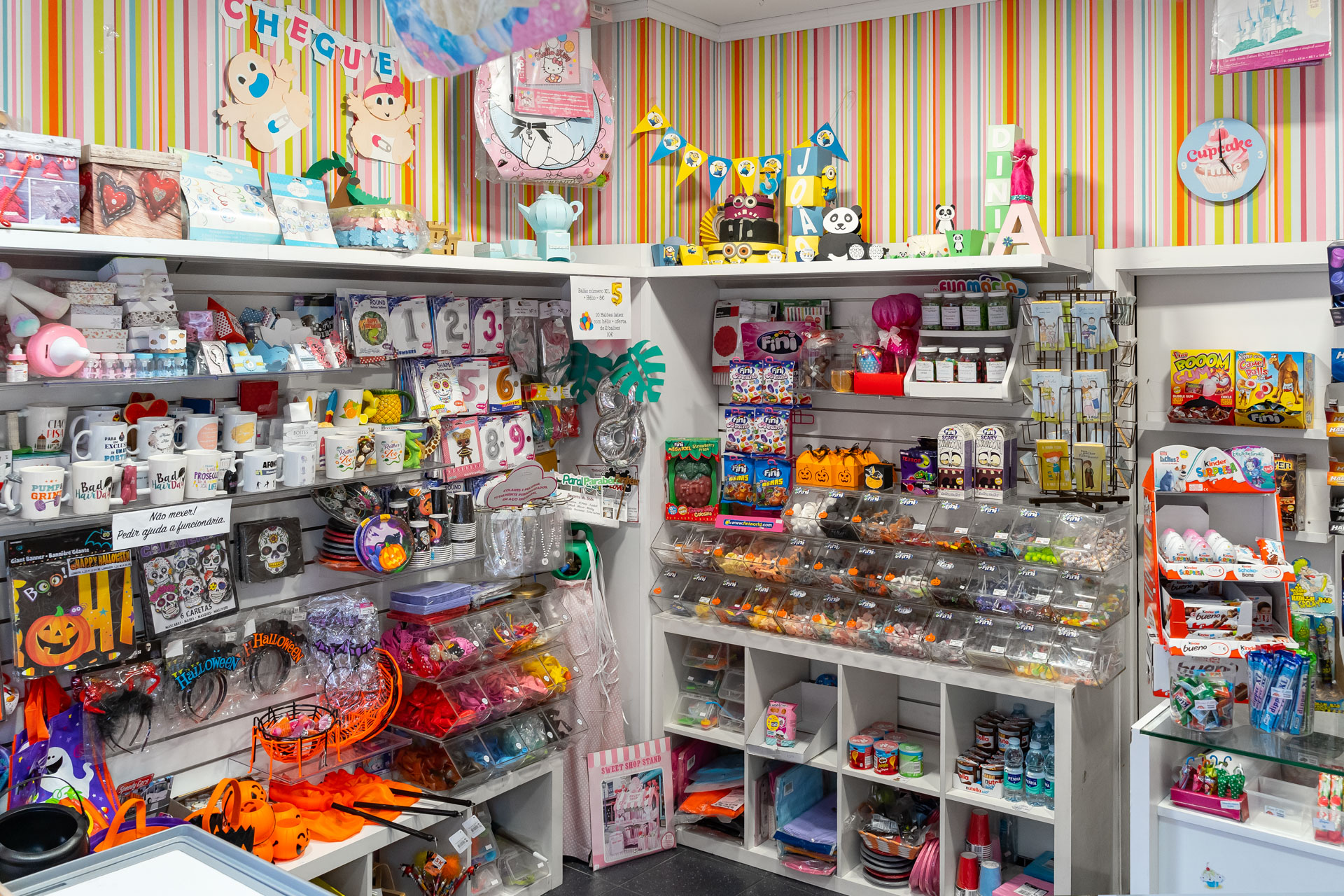 Gomas, rebuçados, artigos de festa, bolos, gelados