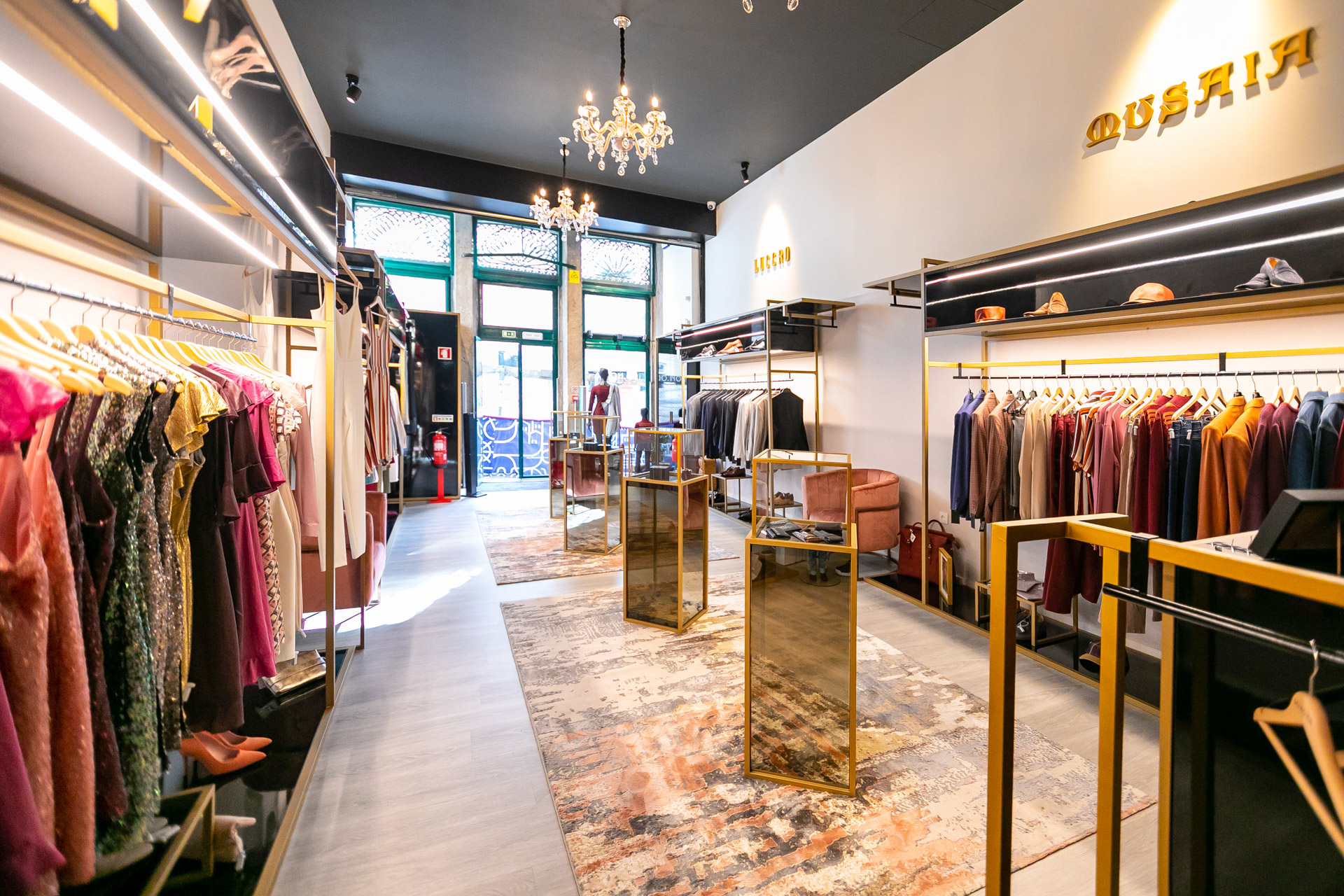 Vestuário exclusivo, vestidos, fatos.