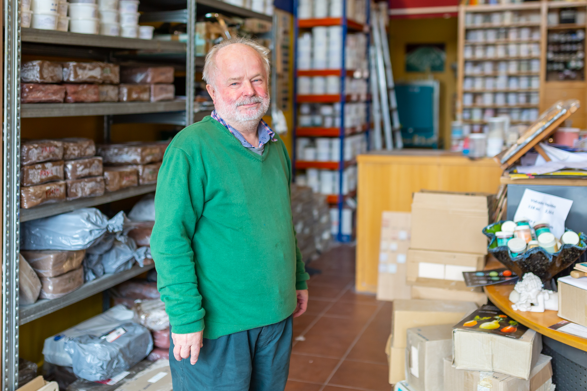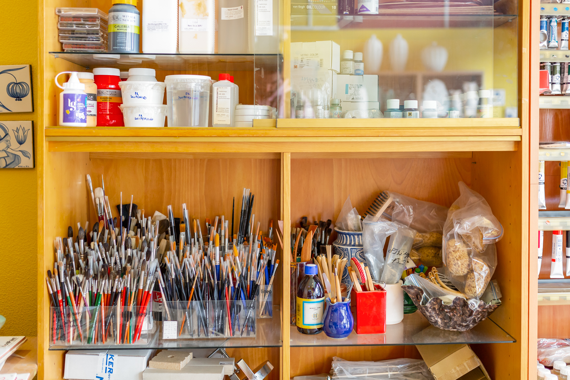 Barro, tintas, vidrados, pincéis, ferramentas, equipamentos, fornos, roda de oleiro