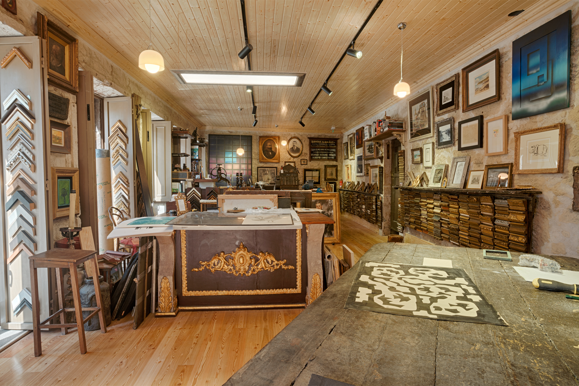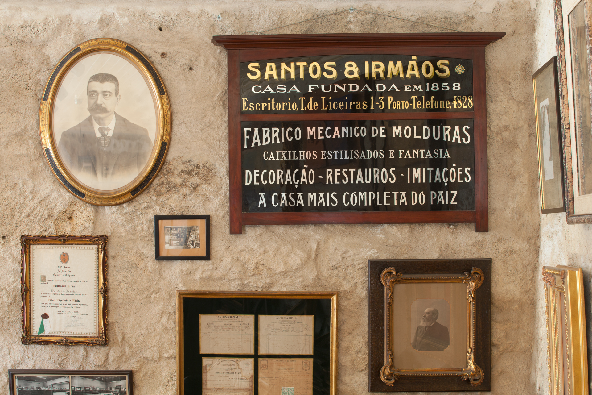 Esta é a primeira oficina de molduras da cidade. Foi fundada em 1858 por dois irmãos, António e José dos Santos e o negócio ainda se mantém na família. A arte de dourar e pratear com folha de ouro ou prata é uma arte em vias de extinção, mas não aqui, onde valorizam este ofício, utilizando técnicas e materiais tradicionais para reproduzir objetos clássicos, mas também criando objetos únicos e contemporâneos. Ao longo da sua existência foram vários os artistas que criaram modelos de molduras ou margens, como António Carneiro, Henrique Medina e Fernando Lanhas. Dos prémios, destacam-se a Medalha de Bronze na Exposição Universal de Paris de 1900, e a Medalha de Ouro na Exposição Industrial Portugueza, em 1933.